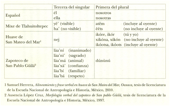 En español tenemos dos pronombres de tercera persona él y ella, y dos primeras personas del plural, nosotras y nosotros. Su diferencia es el género gramatical (no el sexo). El mixe de Tlahuitoltepec, por otra parte, también tiene dos pronombres de tercera persona, pero uno señala si de quien se habla o de lo que se habla está visible, y el otro si está ausente, de la mirada inmediata. También tiene dos nosotros, uno que incluye al interlocutor y el otro que lo excluye. El huave, por su parte, tiene un solo pronombre de tercera persona del singular y seis de primera del plural; de hecho, tiene una palabra especial para ‘tú y yo’. El zapoteco de San Pablo Güilá, finalmente, tiene un único nosotros pero seis pronombres de tercera persona: uno para cosas, otro para animales, otro para seres sagrados, otro para el trato familiar, otro para el de confianza y otro que indica respeto.