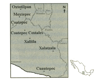 He escogido un tanto cuanto al azar siete comunidades nahuas, tres del estado de México, Oxtotilpan (municipio de Temascaltepec), Mextepec (municipio de Sultepec) y Coatepec (municipio de Tlatlaya) y cuatro del de Guerrero: la cabecera municipal de Coatepec Costales, Xalitla (municipio de Tepecuacuilco), Xalatzala (municipio de Tlapa), y la cabecera municipal de Cuautepec.[3]