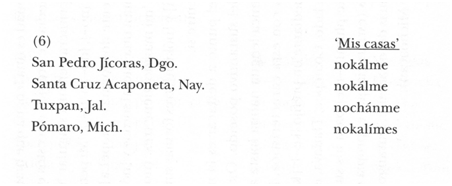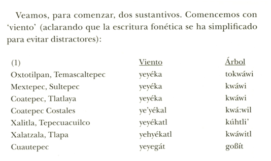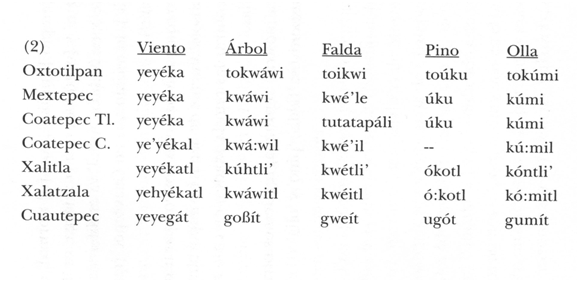 Ahora las regularidades se ven con más claridad y la homogeneidad de estas siete hablas se cuestiona de inmediato. Oxtotilpan, por ejemplo, presenta dominantemente un “to” que ninguna otra habla tiene. Todas las palabras de Oxtotilpan, Mextepec y Coatepec Tlatlaya, las tres del estado de México, terminan con vocal: [yeyéka], [kwáwi], [kwé’le], [úku] y [kúmi], a diferencia de las palabras de Ias comunidades de Guerrero que todas terminan en consonante. Todas las de Coatepec Costales, fuera de otros detalles, terminan con [1]: [ye’yékal], [kwá:wil], [kwé’il] y [kú:mii].