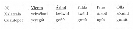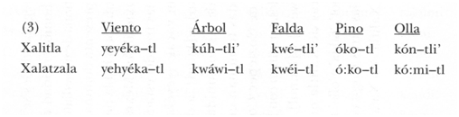 Las palabras de Xalitla que terminan con [tli’], ‘árbol’, ‘falda’ y ‘olla’, terminan con [iti] o [it] en las otras lenguas (ejemplifico comparando Xalitla con Xalatzala).