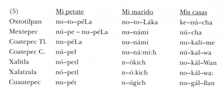 El náhuatl es una lengua que marca la posesión mediante prefijos (en estos ejemplos, es el de primera persona singular ‘mi’, cuya forma es {no-}, {nu} o {n-}). ‘Mi petate’ tiene básicamente dos formas: [nopéLa] —la representa a una lateral sorda— y [nópetl]. En cambio, ‘mi marido’ tiene tres: [notoLáka], [nunámi] y [nókich]; tres formas sin relación alguna entre sí.