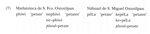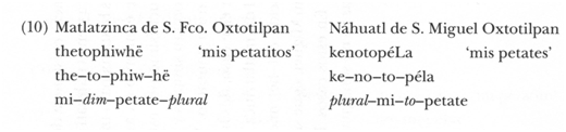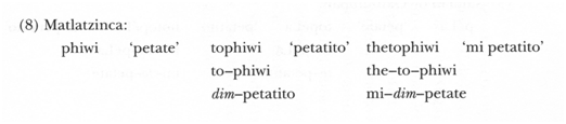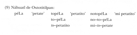b) El {to-} del náhuatl no se puede identificar ahora como ‘diminutivo’ porque no únicamente aparece en los sustantivos; también lo hace en los adjetivos y en los verbos. En matlatzinca, sólo aparece con sustantivos (esto nos podría indicar más bien un uso de respeto):