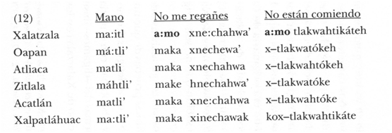 El segundo ejemplo es el de Xalatzala, comunidad guerrerense que, si la analizamos un poco más en detalle vemos que tiene varios rasgos que no corresponden con los que se identifican como característicos del náhuatl de la región central de Guerrero. Por ejemplo, a) existe una clase de sustantivos en el centro de Guerrero que tienen un sufijo {-tli} que en otros lugares (como Xalatzala) terminan con [itl] (por ejemplo, ‘mano’); b) asimismo, Xalatzala emplea la negación a:mo tanto en el imperativo negativo (para decir, por ejemplo, ‘no me regañes’) como en el indicativo (en ‘no están comiendo’), las demás comunidades utilizan maka para el imperativo negativo y {x-} para la negación en indicativo (o {kox-}, como Xalpatlahuac).