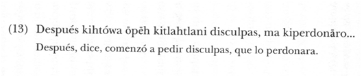 Por ejemplo disculpas. En español es plural, en náhuatl no. Y no lo es porque en la cosmovisión de Ozomatlán, sólo los seres animados pueden ser pluralizados (y disculpas no es un ser animado). Esto se corrobora por la concordancia que va señalada en el verbo pedir. Mucho más claro es el caso de perdonar: es totalmente nahua.